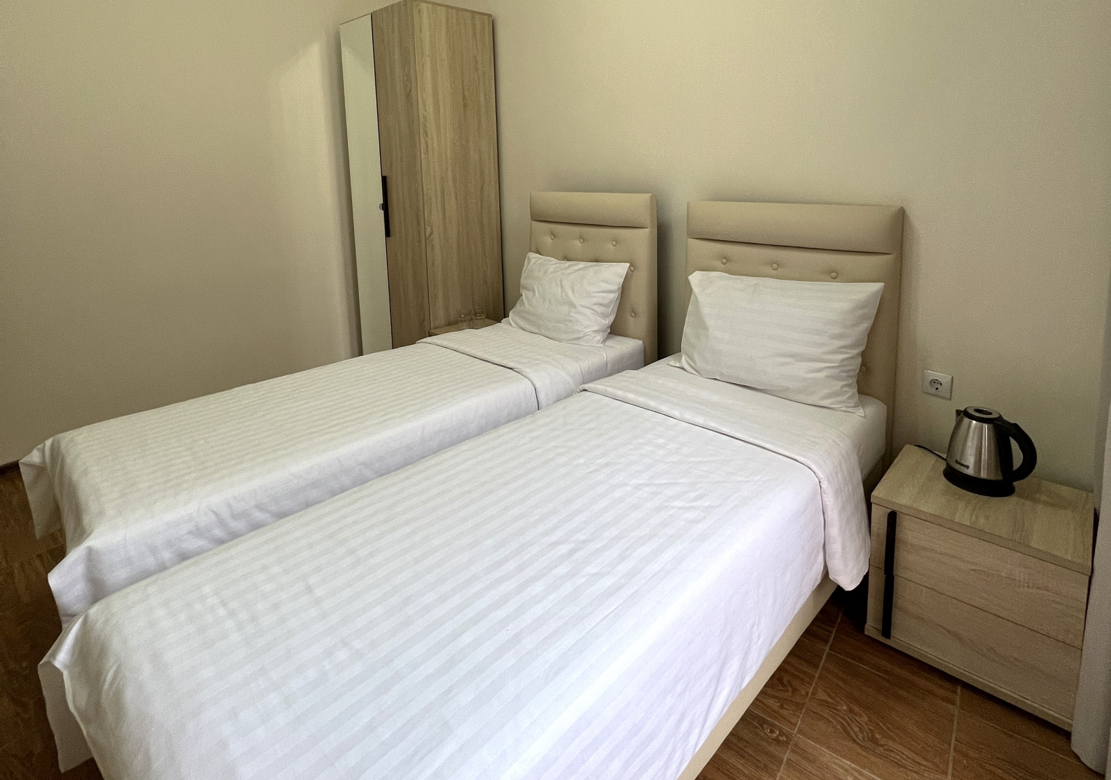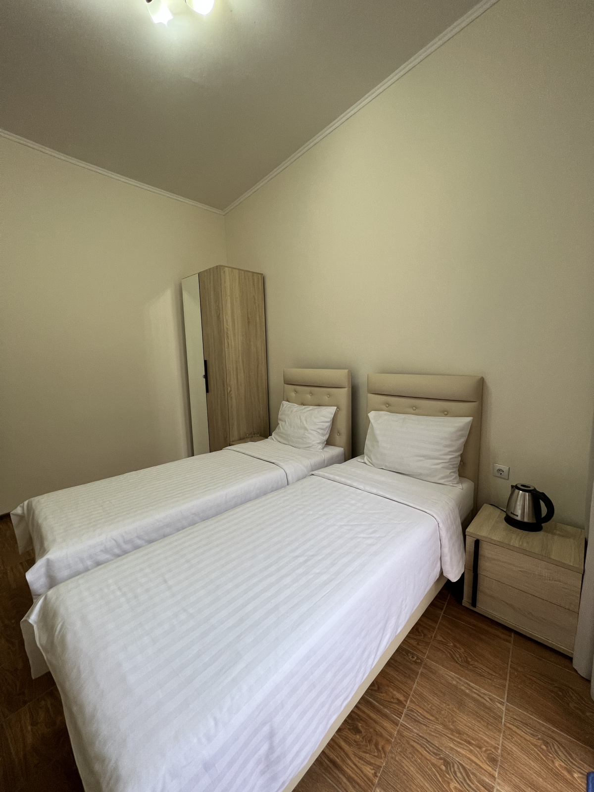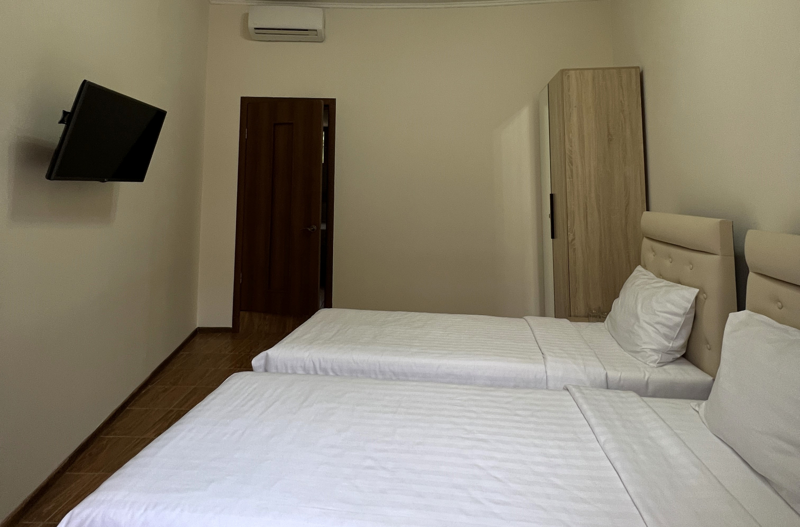 Площадь номера - 40 кв.м. 2 осн. места. 2 доп. места. Мебель: вешалка, зеркало, кровати односпальные (2), кровать двуспальная, прикроватные тумбочки, стол, шкаф. Оборудование: кондиционер, сейф, телевизор, холодильник. Санузел: с душем, тапочки, туалетные принадлежности, фен, халат. Сервис: Wi-Fi бесплатно, смена полотенец, смена постельного белья, уборка номера.