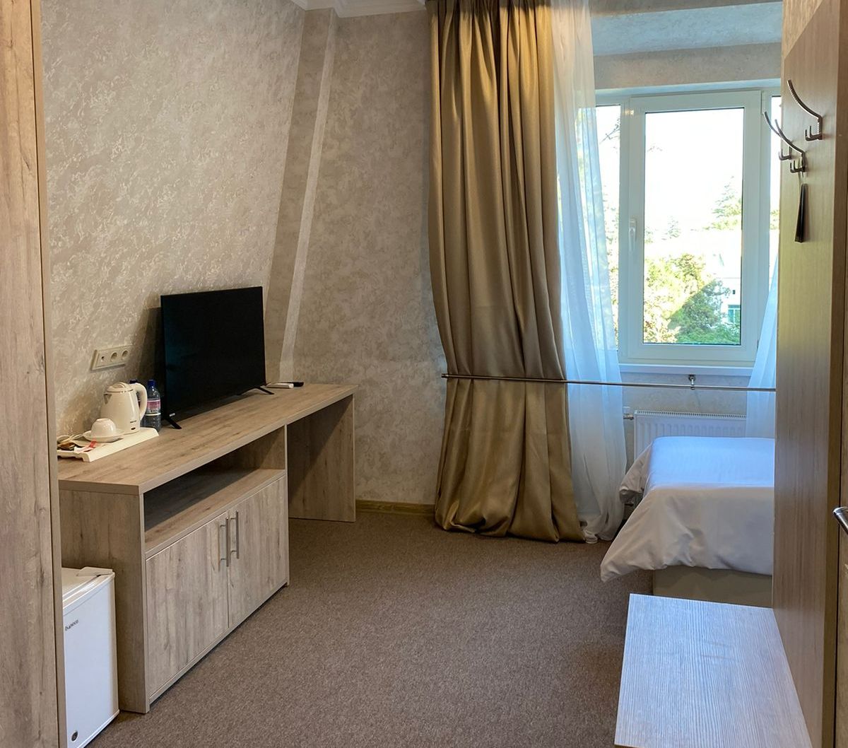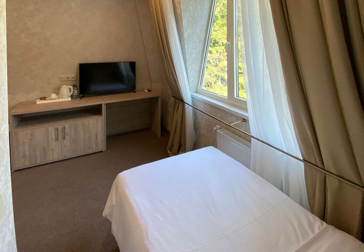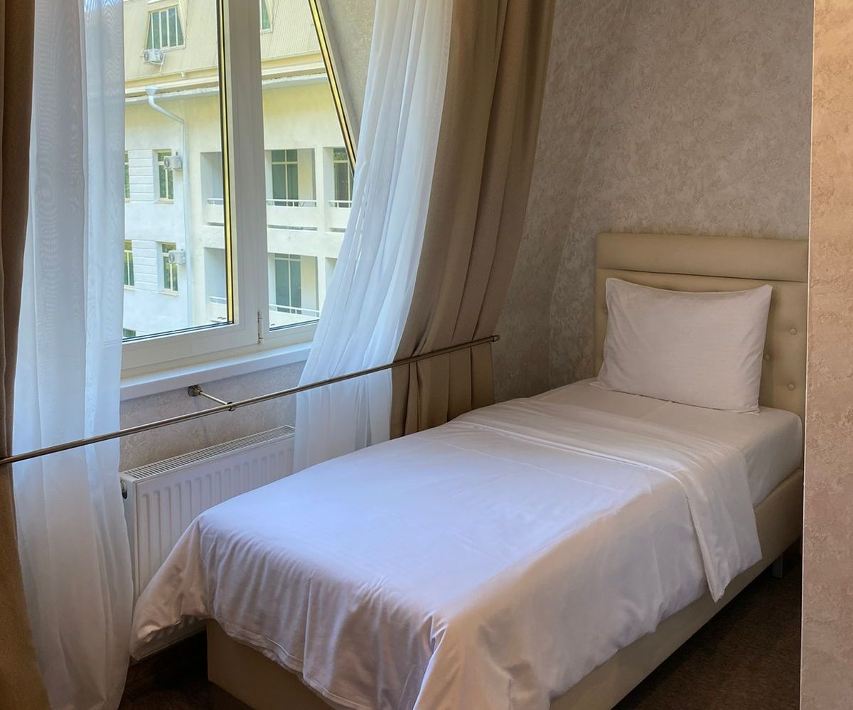 Площадь номера - 8 кв.м. 1 осн. место. Мебель: вешалка, зеркало, кровать односпальная, прикроватная тумбочка, стол, шкаф. Оборудование: кондиционер, сейф, телевизор, холодильник. Санузел: с душем, тапочки, туалетные принадлежности, фен, халат. Сервис: Wi-Fi бесплатно, смена полотенец, смена постельного белья, уборка номера.