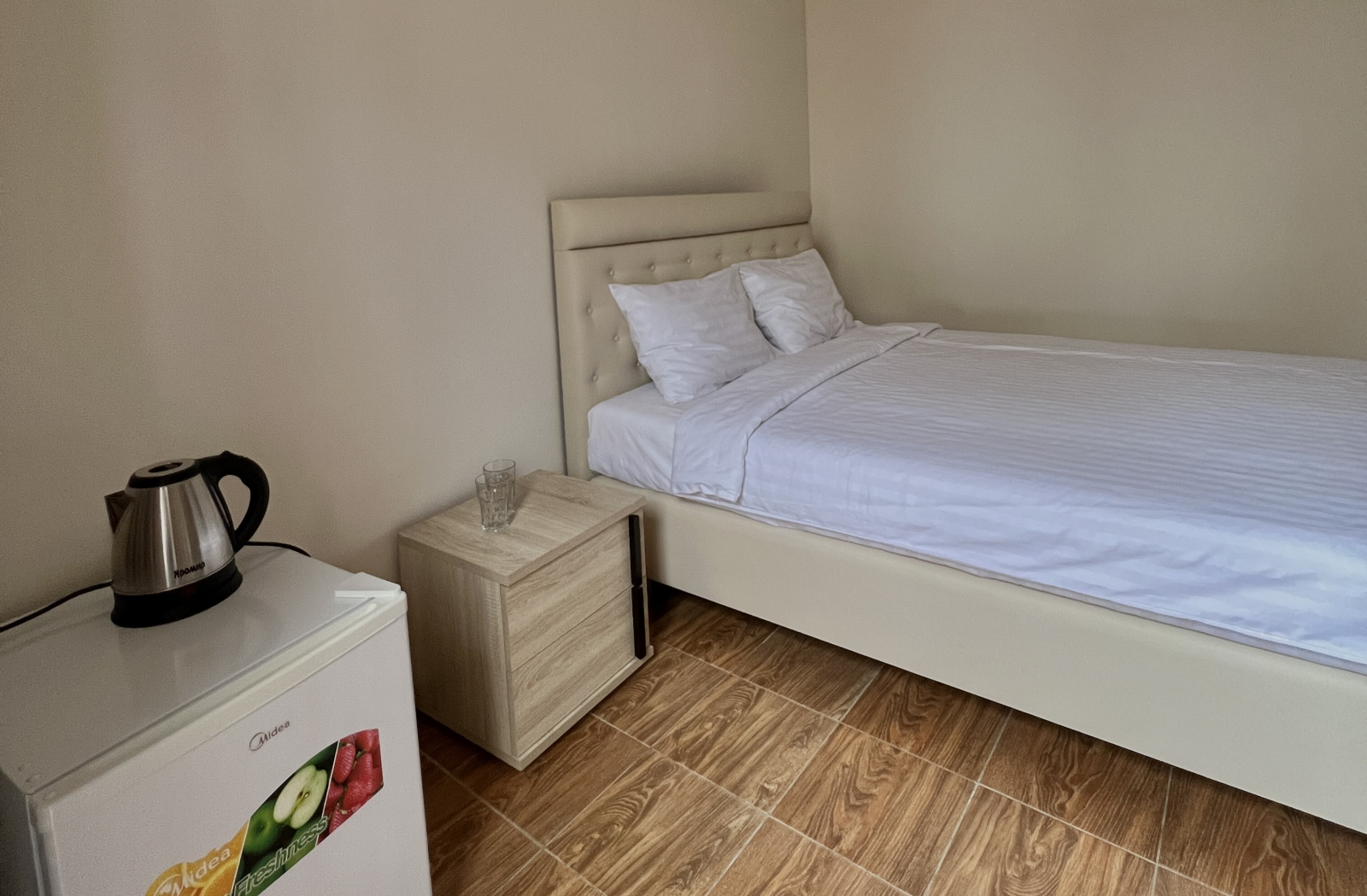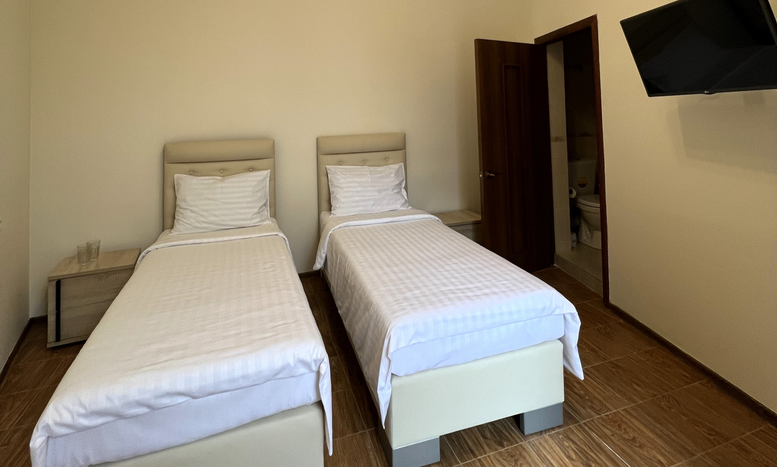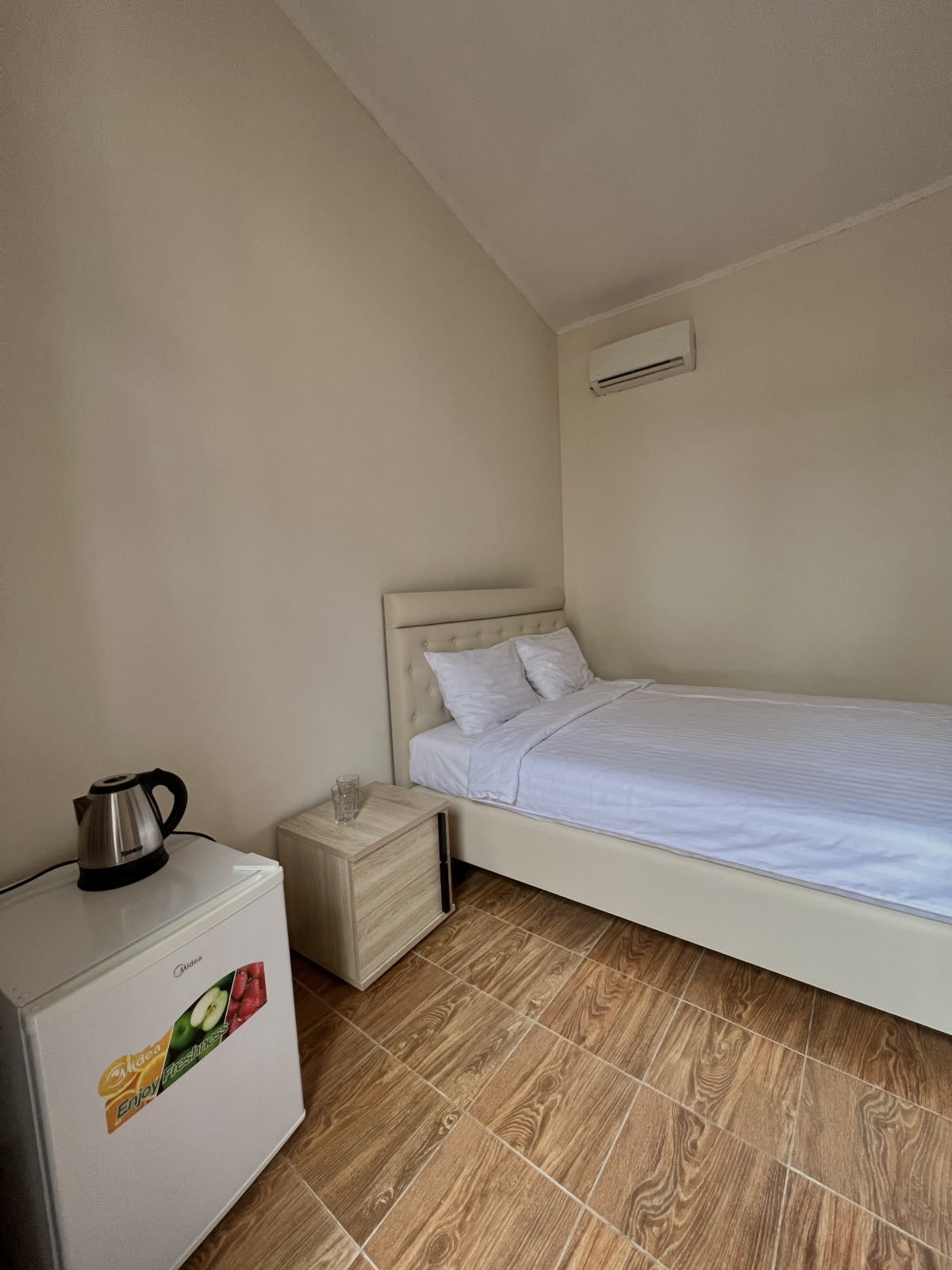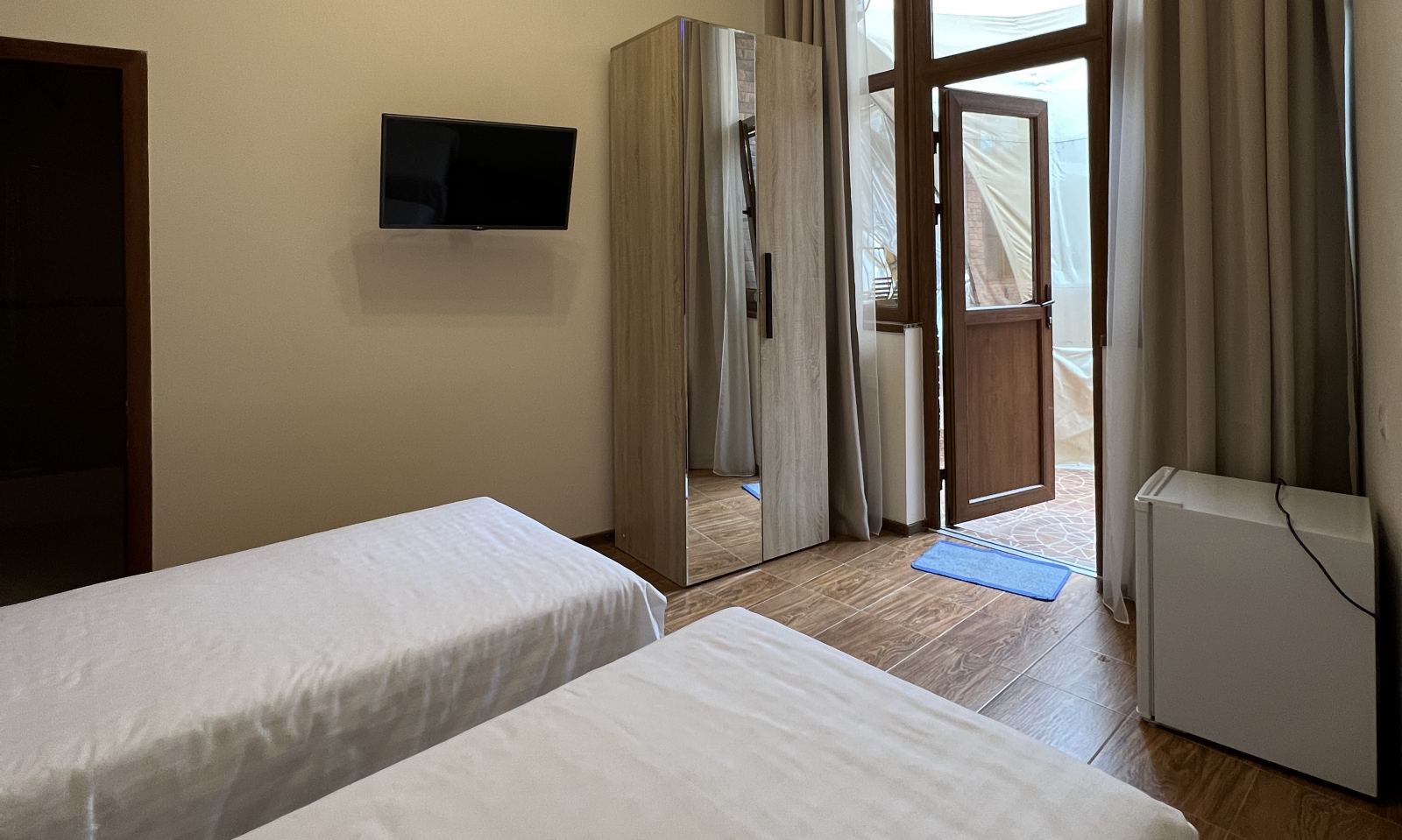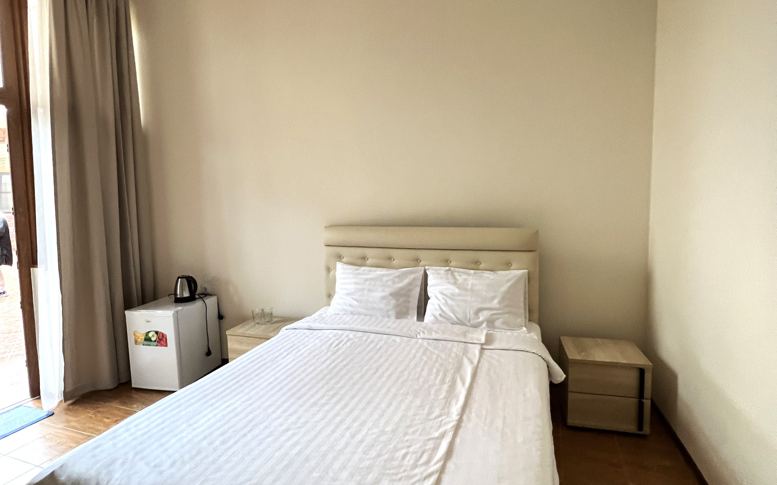 Площадь номера - 12 кв.м. 2 осн. места. 1 доп. место. Мебель: вешалка, зеркало, кровати односпальные /одна двуспальная кровать, прикроватные тумбочки, стол, шкаф. Оборудование: кондиционер, сейф, телевизор, холодильник. Санузел: с душем, тапочки, туалетные принадлежности, фен, халат. Сервис: Wi-Fi бесплатно, смена полотенец, смена постельного белья, уборка номера.