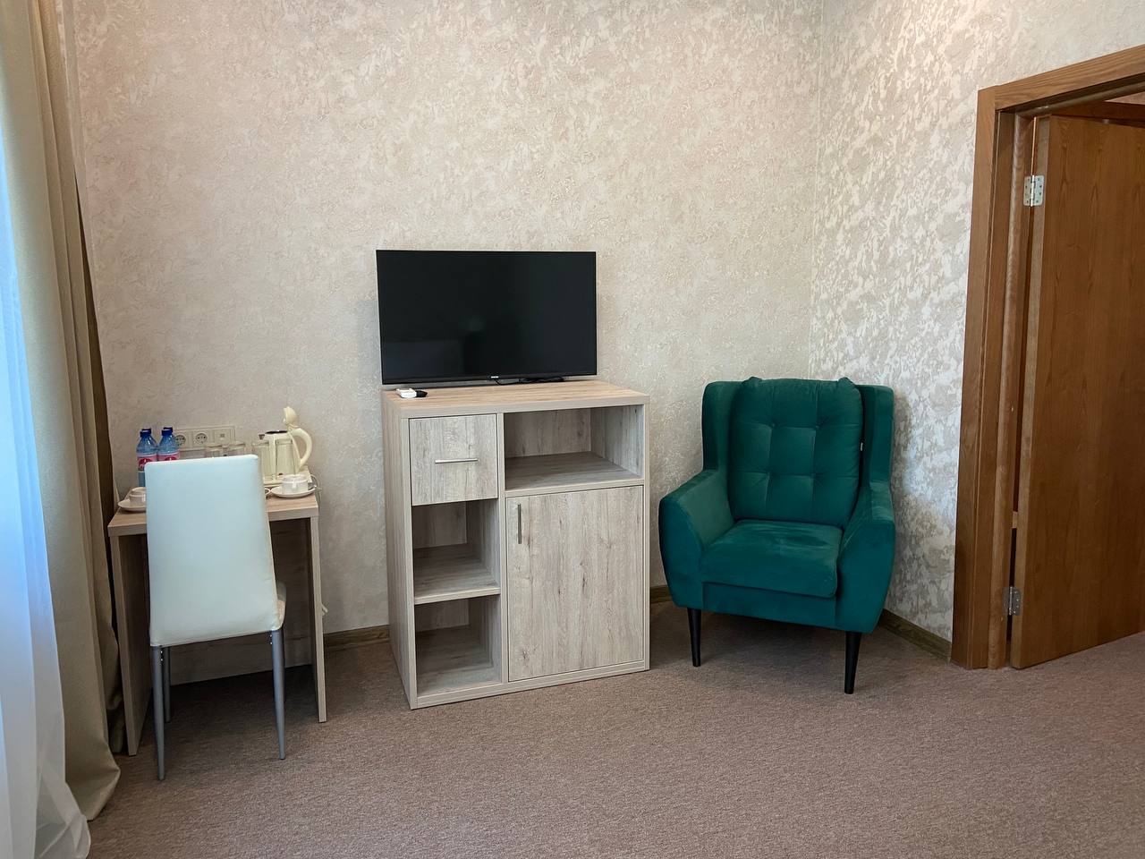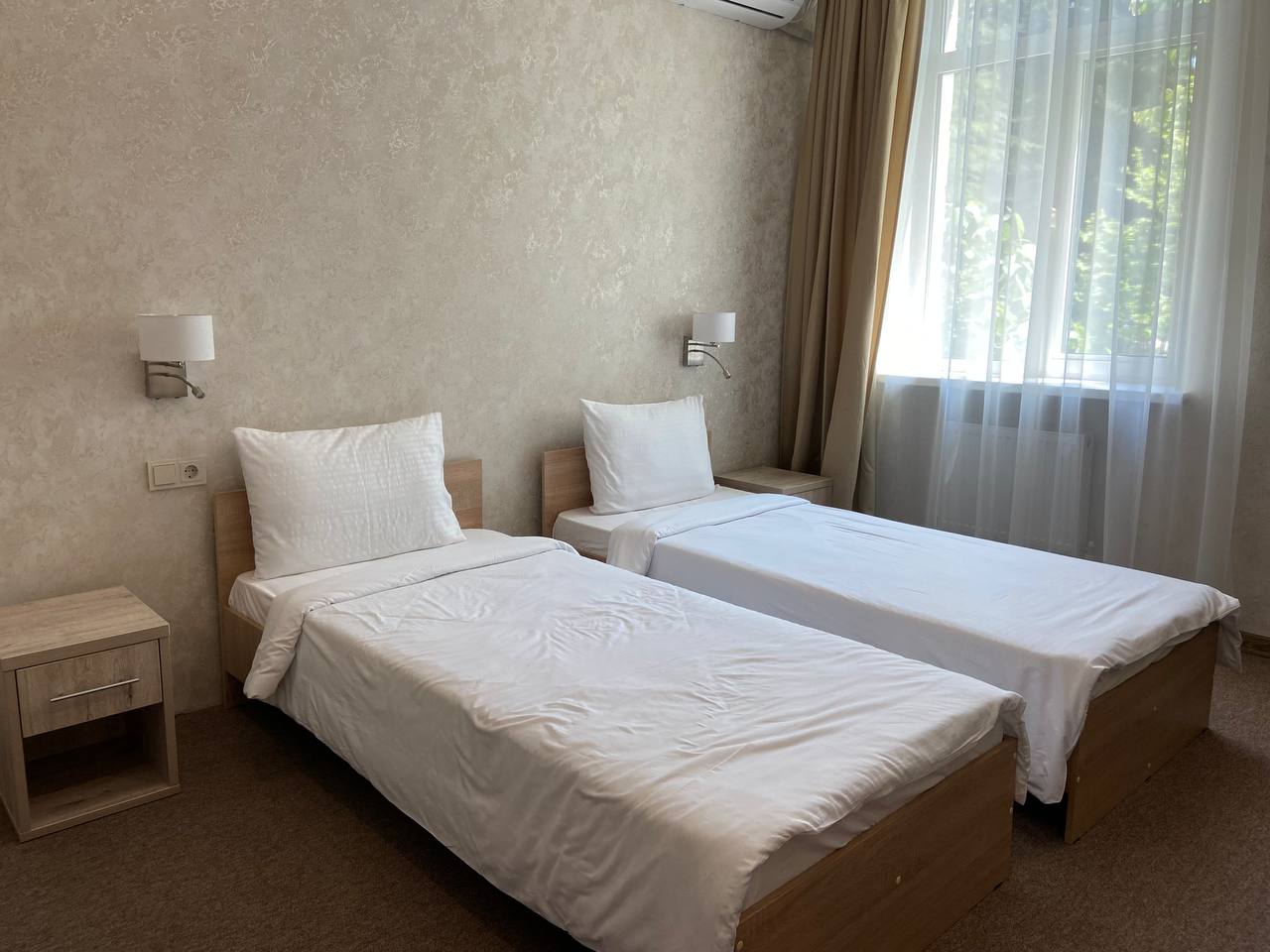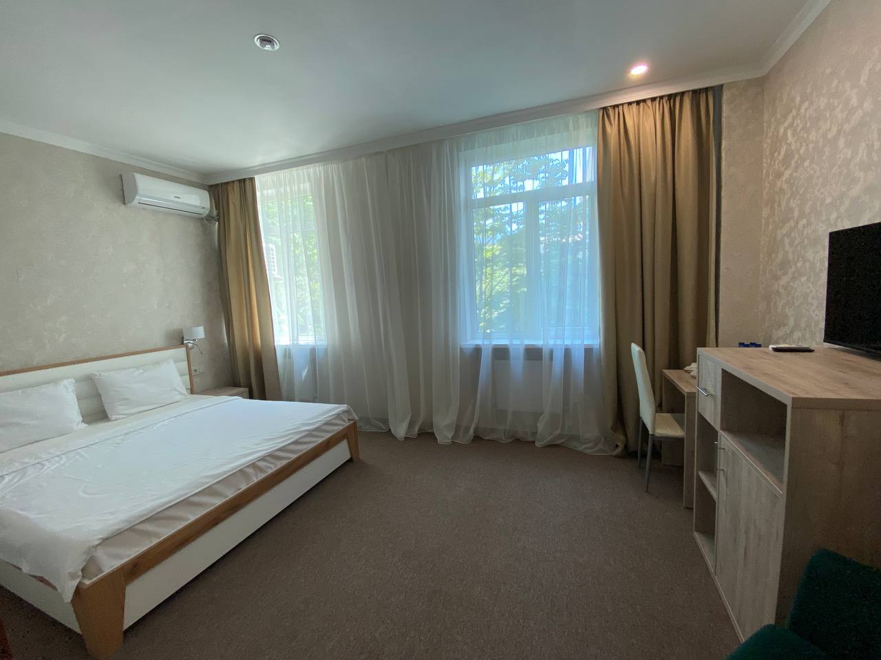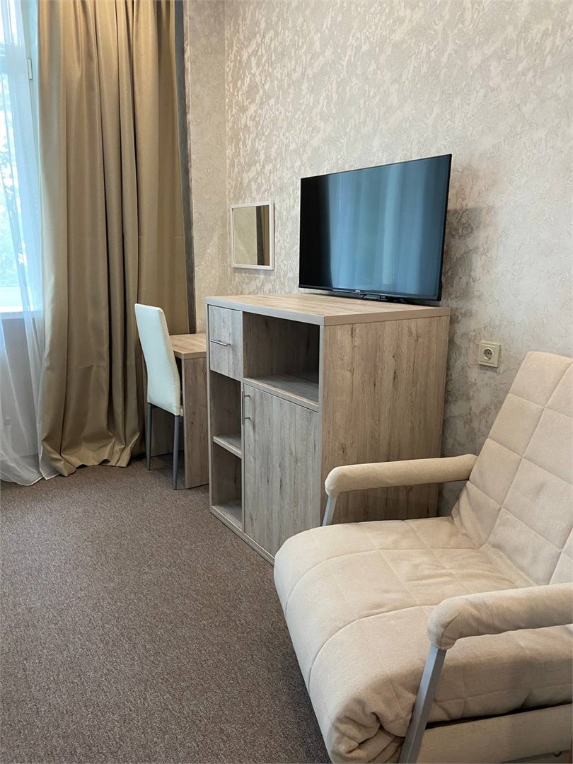 Площадь номера - 60 кв.м. 2 осн. места. 3 доп. места. Мебель: вешалка, диван, зеркало, комод, кресло, кровати односпальные (2), кровать двуспальная, прикроватные тумбочки, стол, стул, шкаф. Оборудование: кондиционер, набор посуды, сейф, телевизор, холодильник, электрочайник. Санузел: с душем, тапочки, туалетные принадлежности, фен, халат. Сервис: Wi-Fi бесплатно, смена полотенец, смена постельного белья, уборка номера.