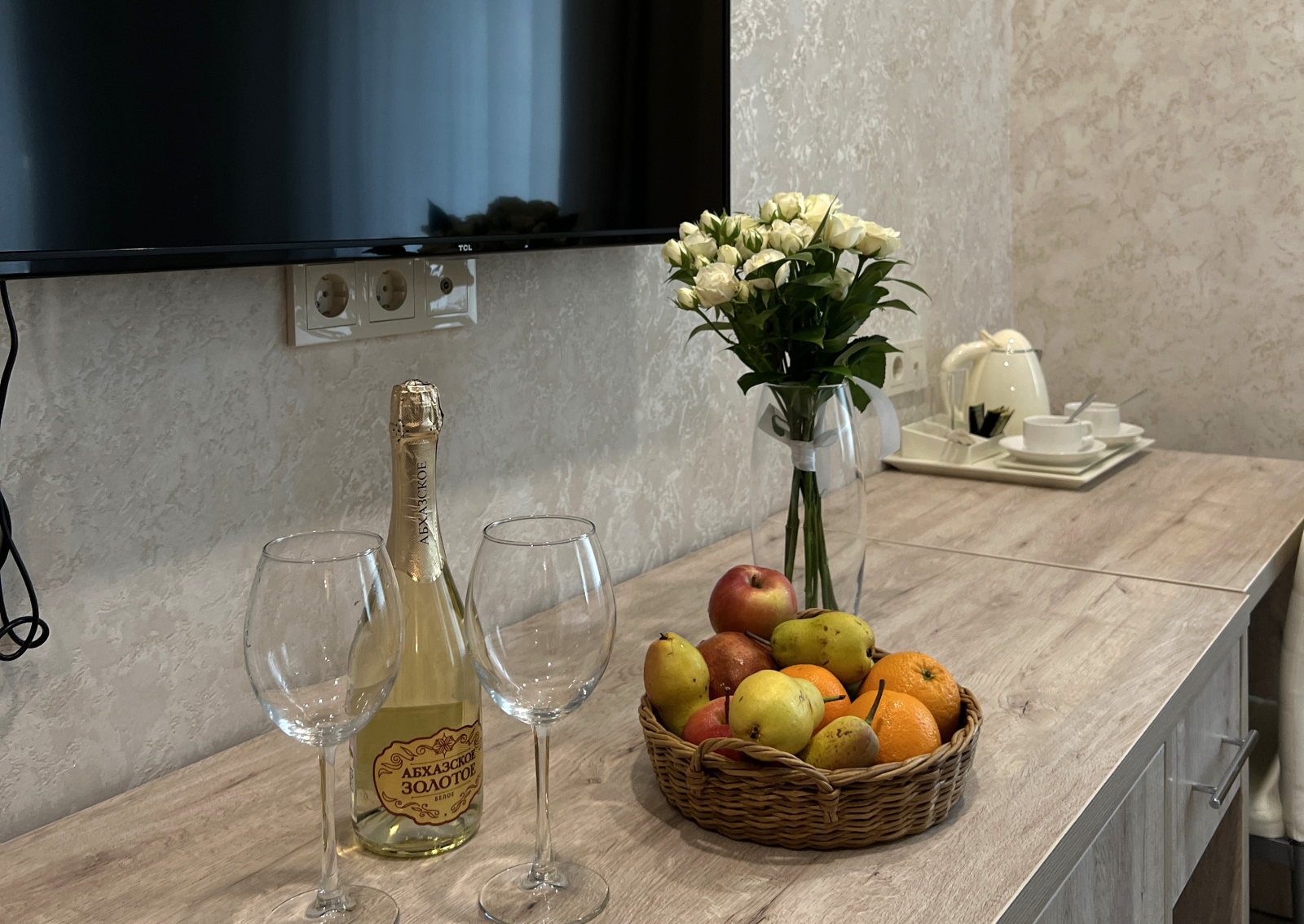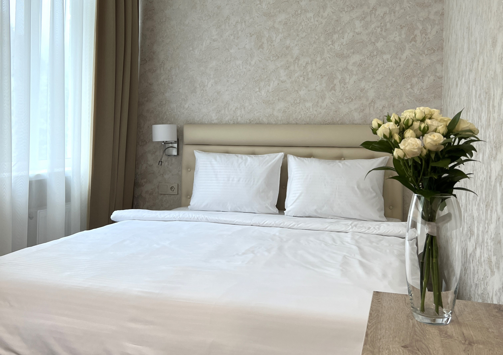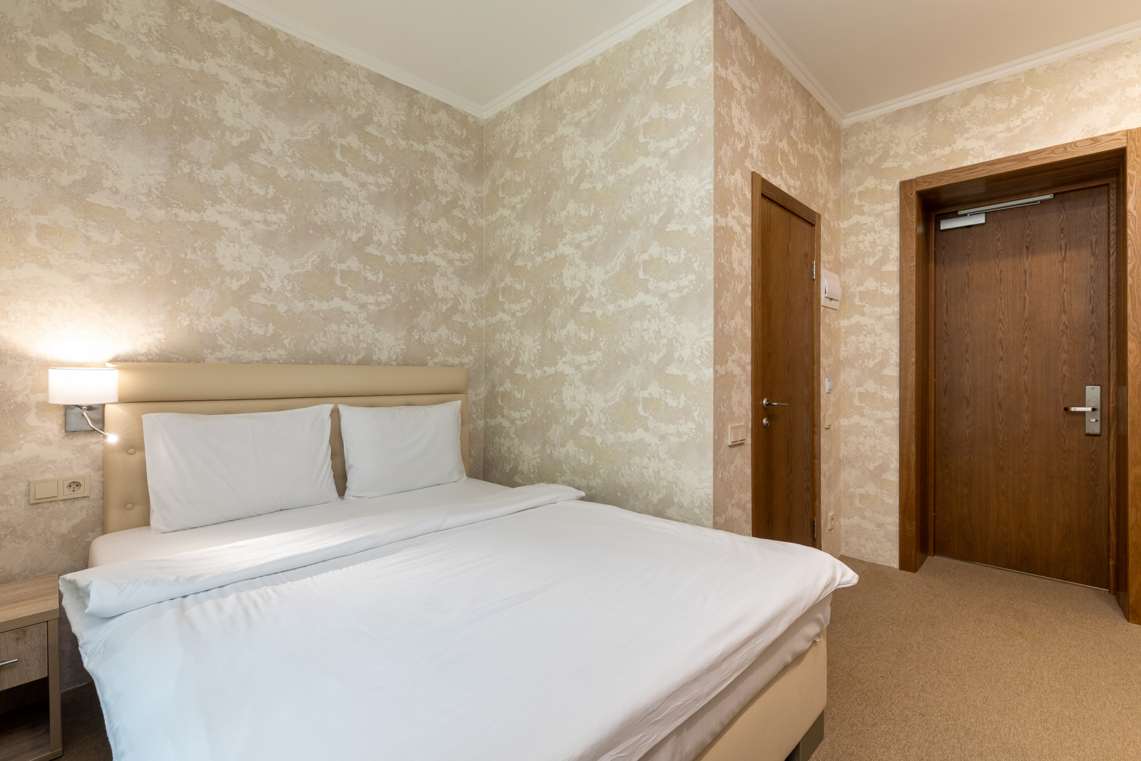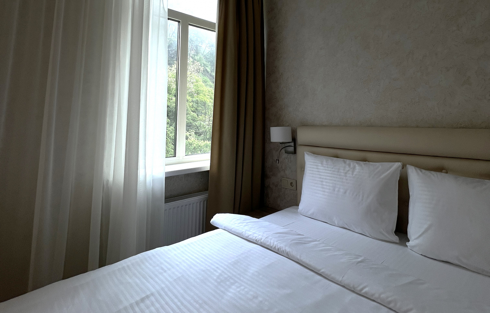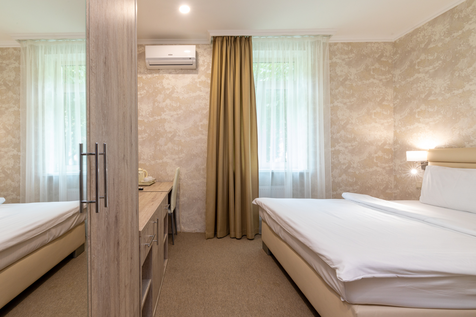 Площадь номера - 15 кв.м. 2 осн. места. 1 доп. место. Мебель: вешалка, зеркало, кровати односпальные /одна двуспальная кровать, прикроватные тумбочки, стол, стул, шкаф. Оборудование: кондиционер, сейф, телевизор, холодильник. Санузел: с душем, тапочки, туалетные принадлежности, фен, халат. Сервис: Wi-Fi бесплатно, смена полотенец, смена постельного белья, уборка номера.