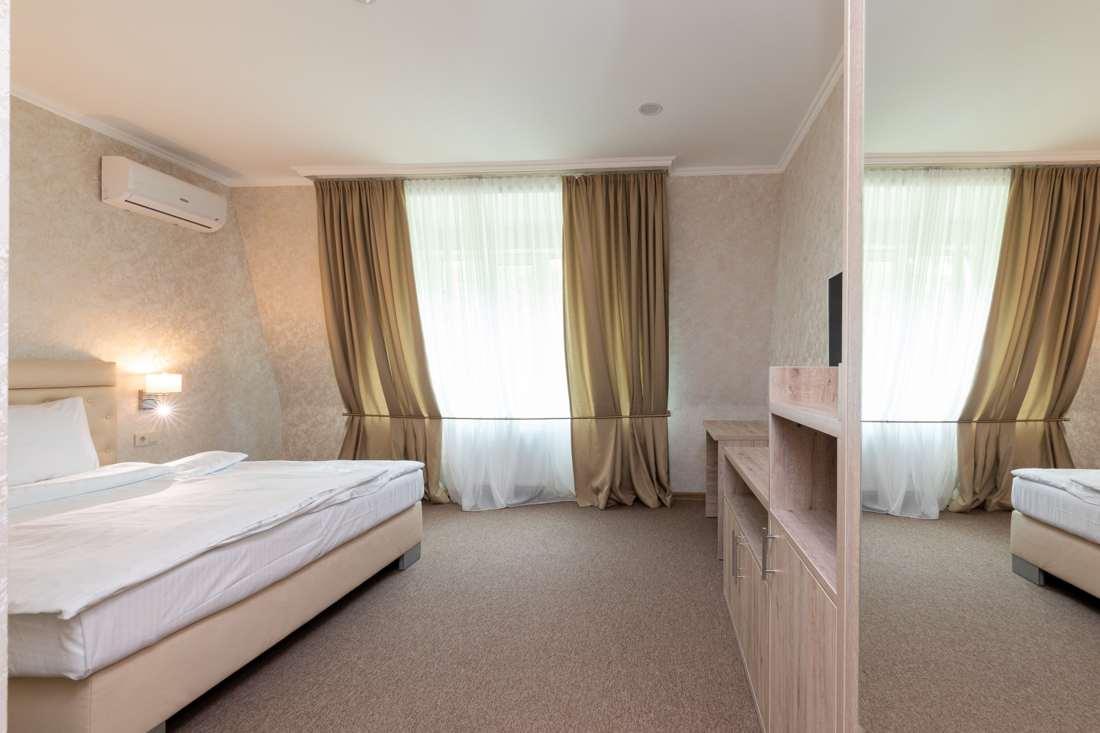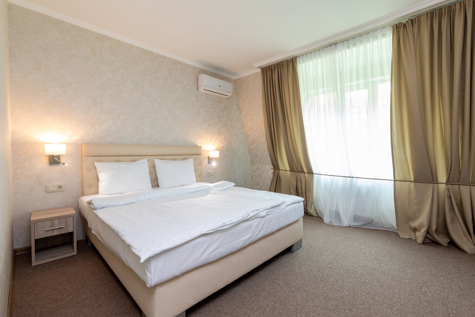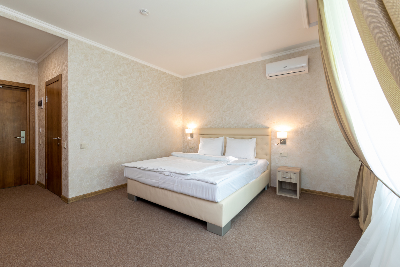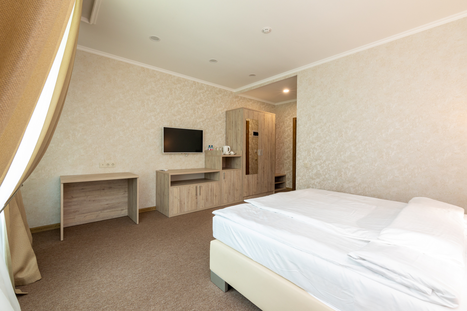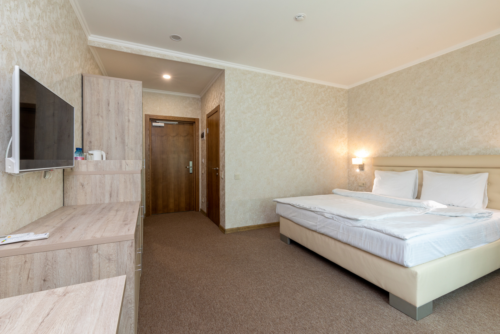 Площадь номера - 14-15 кв.м. 2 осн. места. Мебель: вешалка, зеркало, кровати односпальные /одна двуспальная кровать, прикроватные тумбочки, стол, стул, шкаф. Оборудование: кондиционер, сейф, телевизор, холодильник. Санузел: с душем, тапочки, туалетные принадлежности, фен, халат. Сервис: Wi-Fi бесплатно, смена полотенец, смена постельного белья, уборка номера.